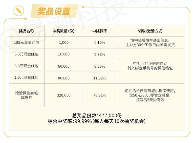 活动共设五类奖品,总份数达47.7万份。其中,最吸引人的当属188元真金红包,共1000份,中奖概率为0.15%。用户中奖后需填写基础信息,主办方在30个工作日内安排邮寄发货。